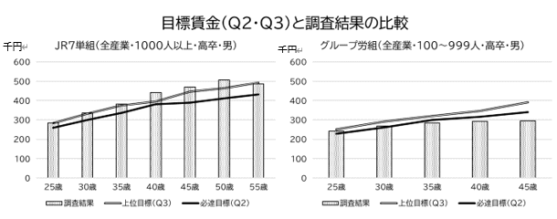 なお、「中期労働政策ビジョン(2024-2028)」で設定したグループ労組の目標賃金は、『産業別・企業規模100〜999人』であり、JR7単組の目標賃金『全産業・企業規模1,000人以上』とも差異があります。賃金水準と目標賃金に差があることも事実ですが、より早期に目標賃金に到達できるよう、これまで以上に意識した取り組みが求められています。